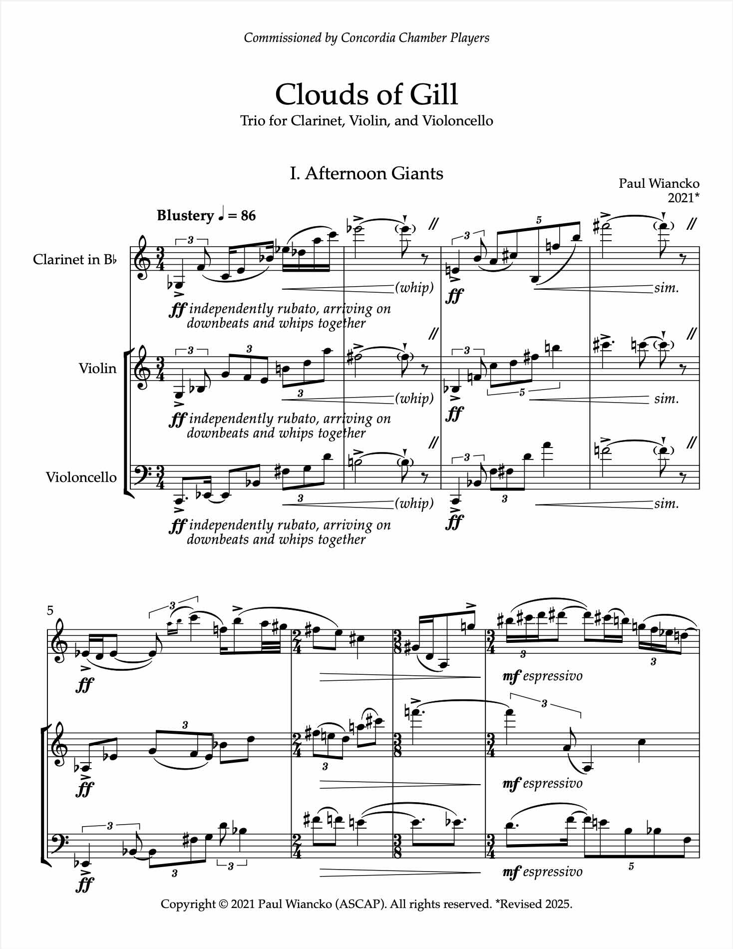 Inspired by several cathartic afternoons spent cloudspotting with his niece Aki during the height of the pandemic, this four-movement trio is Paul's homage to Aki and the majestic skies of Western Massachussetts, as well as a reflection on the inevitability of change and the power of delusion.