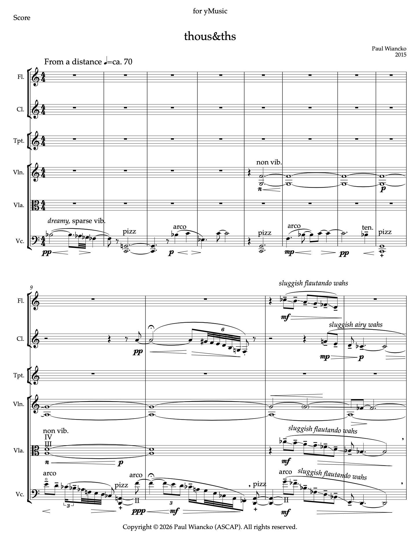 Written for yMusic in 2015, thous&ths (pronouced "thousandths") is a high impact mixed sextet which zooms between the micro and the macro and is driven by its own imperfections. Optional guitar shred moment if the violinist is in the mood.